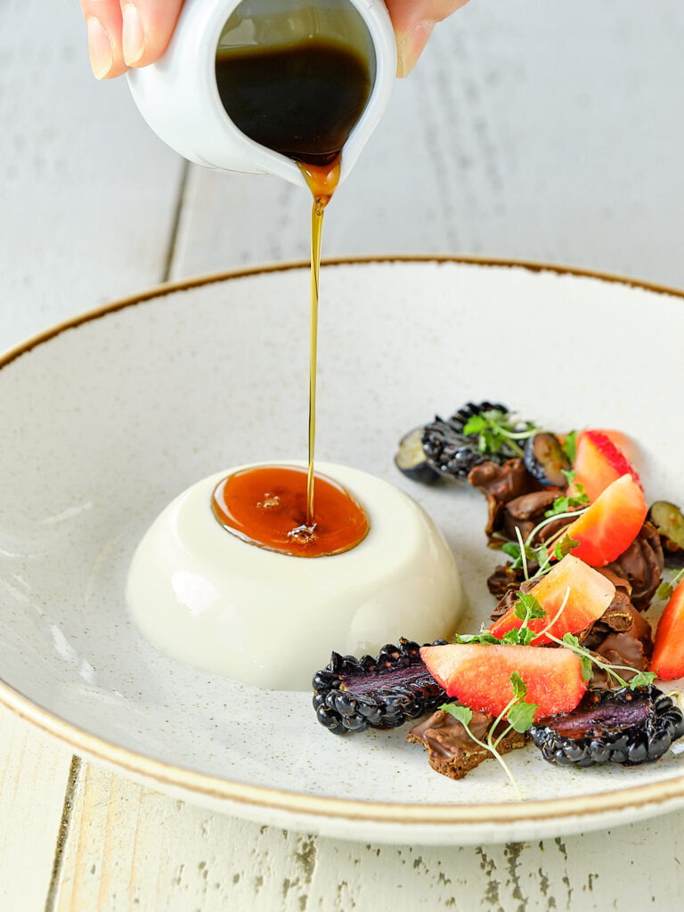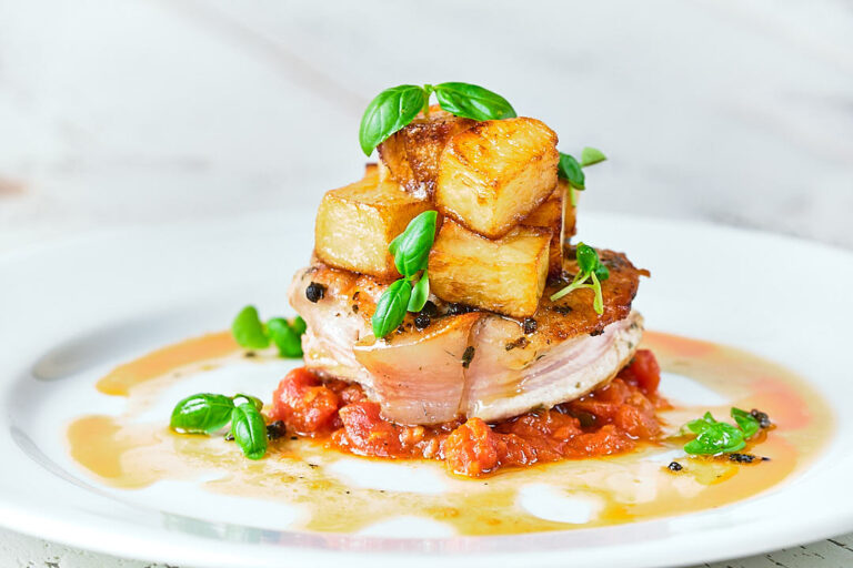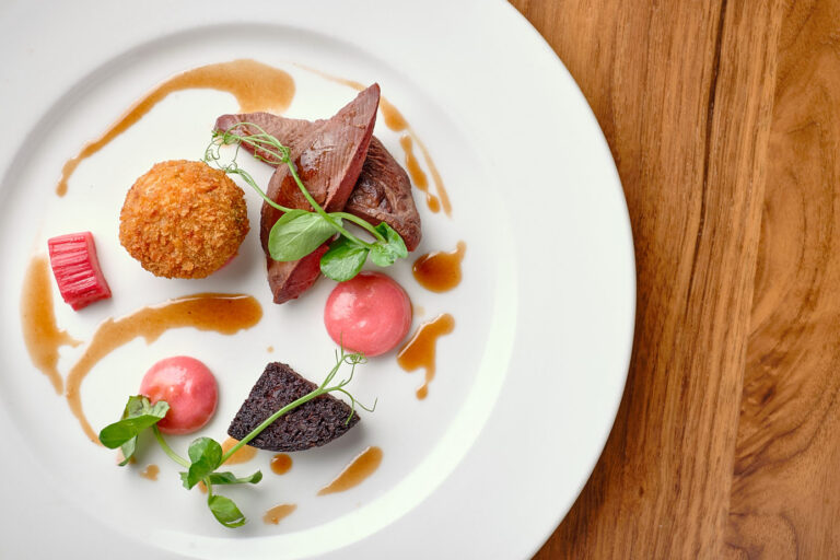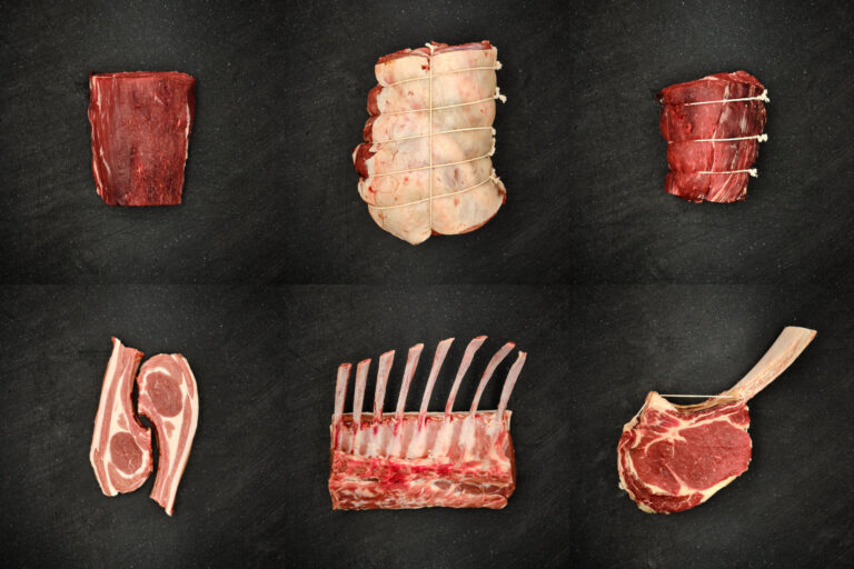 A butcher inspects a cut of meat in chilled storage room at Ruby & White butchers in Clifton, Bristol
